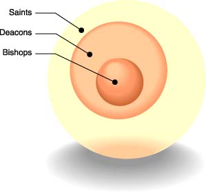 The figure above is called a Venn diagram and illustrates the relationship among the Saints, Deacons, and Bishops as outlined in Phil 1:1. From among the saints (all whom are equal) come the eldership (the chiefs among equals). From among the deacons (all whom are equal) come the bishops (all whom are equal). In some sense we see this in other arenas of life. The President of U.S., is no more "American" than an average citizen, yet he holds a positional authority. The same is true here. In this regard there is no "one-man-ministry" as is the case today. The notion of the Archisynagogos was NOT carried over into the Pauline assembly. In this sense the Pauline assembly is a sort of "oligarchy".